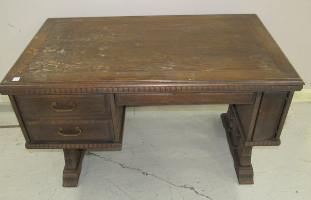 Two side drawers, pull out drawer, has pedestal legs, top has wear, 29"h., 49"w., 29"d. Two side drawers, pull out drawer, has pedestal legs, top has wear, 29"h., 49"w., 29"d.