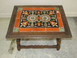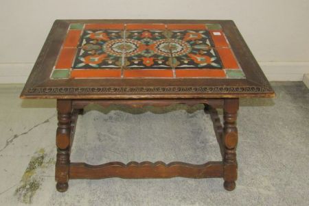 Vintage coffee table with colorful tile inset design on top, border corner trim, there is worn areas on wood, 16"h., 29"w., 22"d. Vintage coffee table with colorful tile inset design on top, border corner trim, there is worn areas on wood, 16"h., 29"w., 22"d.