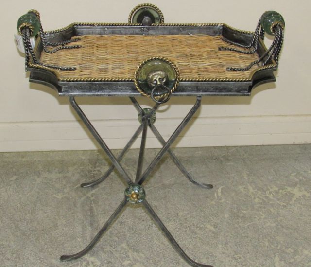 Modern metal serving tray and stand, missing some ball decor on handle, 21"h., 26"w. Modern metal serving tray and stand, missing some ball decor on handle, 21"h., 26"w.