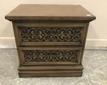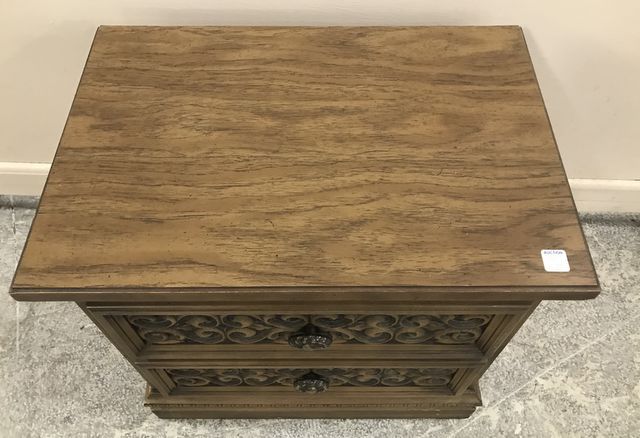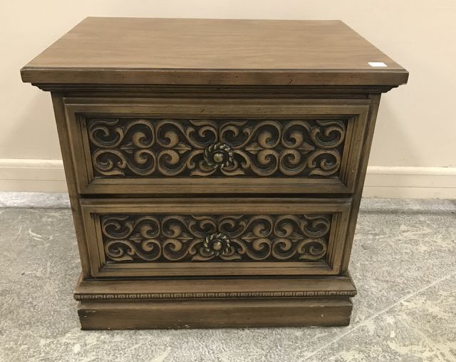 Two drawer night stand with carved design drawers, illuminate wood top, 23"h., 24"w., 16"d. Two drawer night stand with carved design drawers, illuminate wood top, 23"h., 24"w., 16"d.