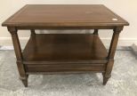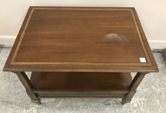 Mid Century two tier table with border trim, the piece has finish wear in spots, 21"h., 28"w., 20"d. Mid Century two tier table with border trim, the piece has finish wear in spots, 21"h., 28"w., 20"d.