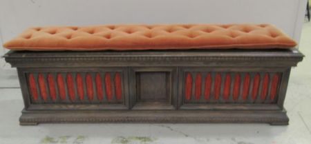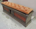 large lift top foot locker or quilt chest, has wear on finish, center wood place needs to be nailed in, 20"h., 71"w., 19"d. large lift top foot locker or quilt chest, has wear on finish, center wood place needs to be nailed in, 20"h., 71"w., 19"d.
