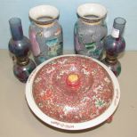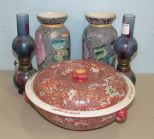 Modern Chinese covered pot, pair of vases 8"h., colorful pair of lanterns 8"h. Modern Chinese covered pot, pair of vases 8"h., colorful pair of lanterns 8"h.