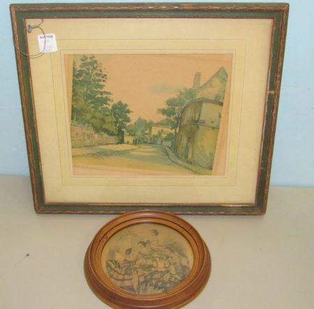 Street in Burgundy signed 13"h., 15"w., round ladies prints 8"dia. Street in Burgundy signed 13"h., 15"w., round ladies prints 8"dia.