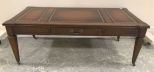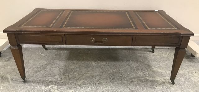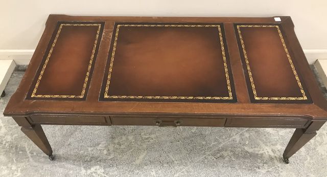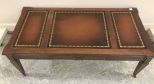 Three leather section top with gold trim work, wood finish has worn spots, 15"h., 44"w., 21"d. Three leather section top with gold trim work, wood finish has worn spots, 15"h., 44"w., 21"d.