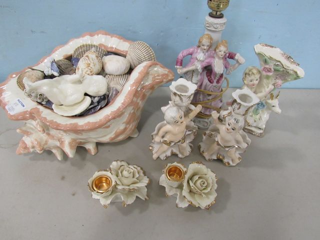 Ceramic shell style decor, English porcelain lamp, planter, pair of candle holders, Avon candle holders. Ceramic shell style decor, English porcelain lamp, planter, pair of candle holders, Avon candle holders.