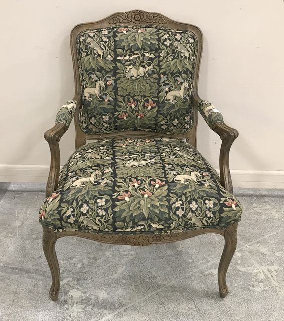 Country French style arm chair with floral upholstery, 36"h. Country French style arm chair with floral upholstery, 36"h.