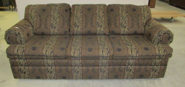 Upholstered three cushion sofa, has some wear, 7' ft. Upholstered three cushion sofa, has some wear, 7' ft.