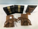 Modern wood carved leopard bookends, pair of black metal bookends, slate with mark emblem display. Modern wood carved leopard bookends, pair of black metal bookends, slate with mark emblem display.