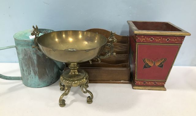 Oak four divided letter organizer, distressed tin water pitcher, butterfly modern planter, brass footed compote 9"h., 9 1/2"dia. Oak four divided letter organizer, distressed tin water pitcher, butterfly modern planter, brass footed compote 9"h., 9 1/2"dia.