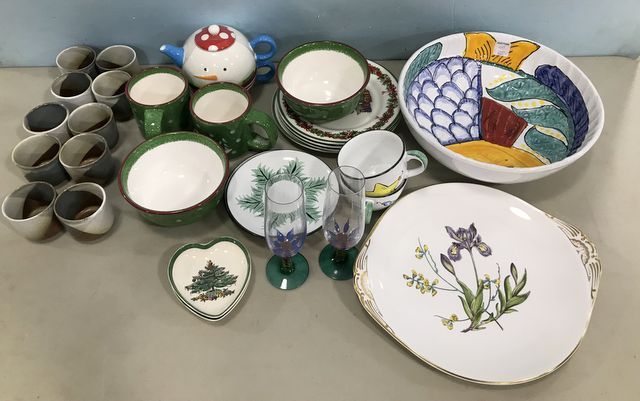Hand painted fish bowl 4"h. 12"dia., Spode Iris & Sphaerolobium tray, Herend pottery mugs and saucers, Log cabin bowl and cups, four traditions Christmas plates, snowman tea pot, stoneware cups 10 total, two signed art glass stems. Hand painted fish bowl 4"h. 12"dia., Spode Iris & Sphaerolobium tray, Herend pottery mugs and saucers, Log cabin bowl and cups, four traditions Christmas plates, snowman tea pot, stoneware cups 10 total, two signed art glass stems.