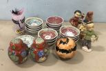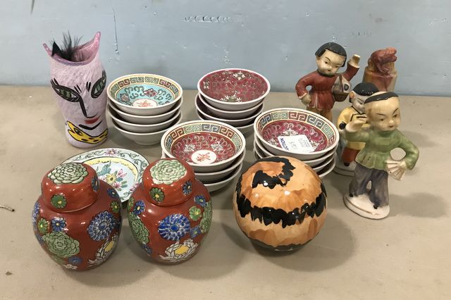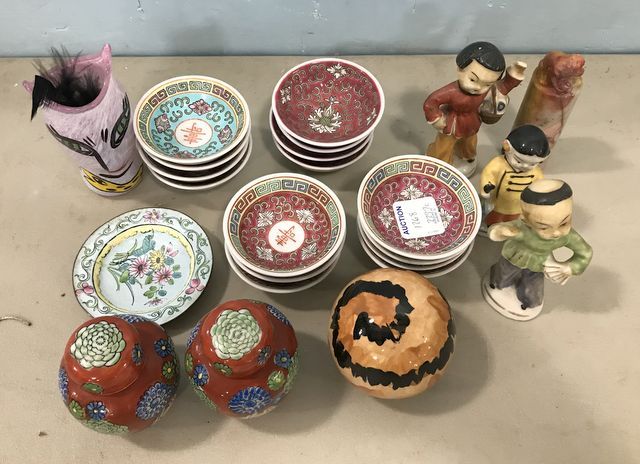 Marble stamp, Chinese sauce dishes, miniature ginger jars, signed art glass cat, hand painted ceramic ball, 3 japanese figurines. Marble stamp, Chinese sauce dishes, miniature ginger jars, signed art glass cat, hand painted ceramic ball, 3 japanese figurines.
