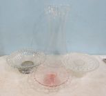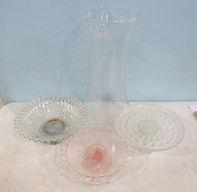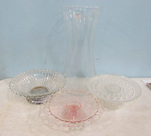 Two glass cake stands, glass compote, and large glass vase 20"h. Two glass cake stands, glass compote, and large glass vase 20"h.