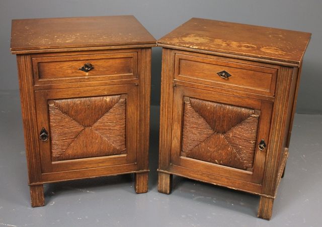 Pair of Wooden Side Tables, single drawer over single door, maker Meldan. 26 1/2" h., 16" d., 20" w. Pair of Wooden Side Tables, single drawer over single door, maker Meldan. 26 1/2" h., 16" d., 20" w.