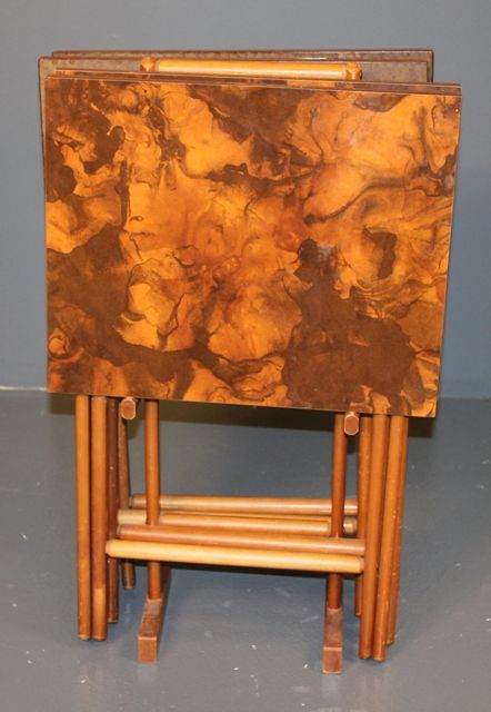 Set of Four Wooden Television Trays and Stand; 29" h., 17 3/4" w. Set of Four Wooden Television Trays and Stand; 29" h., 17 3/4" w.