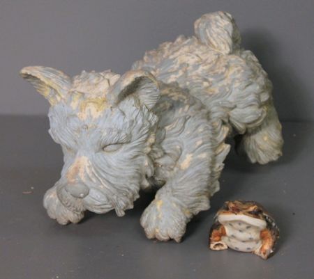 Dog and Frog Outdoor Decorations, dog 14" h., frog 2 1/2" h., 5 1/2" l. (damaged on leg) Dog and Frog Outdoor Decorations, dog 14" h., frog 2 1/2" h., 5 1/2" l. (damaged on leg)