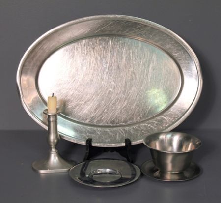 Group of Pewter and Stainless Steel Items; candle holder - 5 1/2" h.; saucer 6 1/4" dia.; oval tray 17 1/2", 12 1/2"; bowl 2 1/2", 5 1/2" dia. Base Group of Pewter and Stainless Steel Items; candle holder - 5 1/2" h.; saucer 6 1/4" dia.; oval tray 17 1/2", 12 1/2"; bowl 2 1/2", 5 1/2" dia. Base