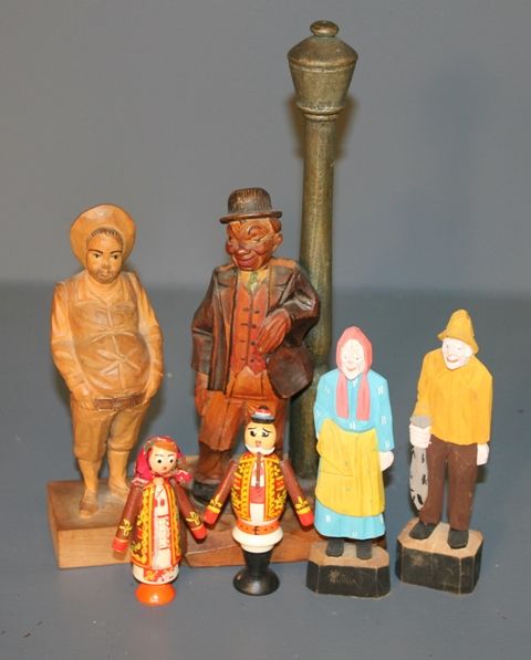 Group of Hand Carved Wooden Figurines; man at street lamp (11" h.), fisherman and old woman pair (6 1/4" h.), man and woman pair (4 1/4" h.), man (7 1/2" marked made in Spain) Group of Hand Carved Wooden Figurines; man at street lamp (11" h.), fisherman and old woman pair (6 1/4" h.), man and woman pair (4 1/4" h.), man (7 1/2" marked made in Spain)