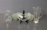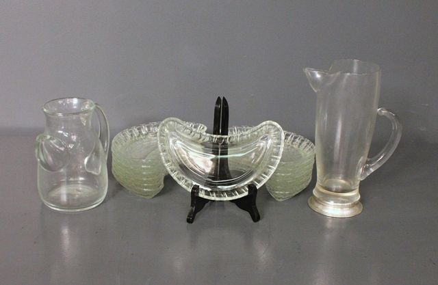 Two Glass Pitchers and Thirteen Clear Glass Bone Dishes, dishes (8" l., 4" w.) one pitcher is 6 3/4" h., other pitcher is 9 3/4" h. Two Glass Pitchers and Thirteen Clear Glass Bone Dishes, dishes (8" l., 4" w.) one pitcher is 6 3/4" h., other pitcher is 9 3/4" h.