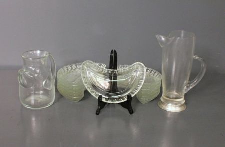 57 Two Glass Pitchers and Thirteen Clear Glass Bone Dishes Description