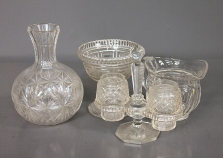 Group of Various Glass Items; oil and vinegar cruet set (missing stoppers) 7 3/4" h., 7" w.; creamer pitcher (4 1/2" h., 7 1/2" w.), candy dish (5 3/4" h., 5 1/2" dia.) vase ( 8 1/4" h., 5 1/2" w. at middle) Group of Various Glass Items; oil and vinegar cruet set (missing stoppers) 7 3/4" h., 7" w.; creamer pitcher (4 1/2" h., 7 1/2" w.), candy dish (5 3/4" h., 5 1/2" dia.) vase ( 8 1/4" h., 5 1/2" w. at middle)