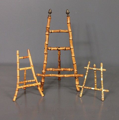 Three Picture Frame Stands; two bamboo style (8 1/2" h., 14 1/4" h.), brass (6 1/4" h.) Three Picture Frame Stands; two bamboo style (8 1/2" h., 14 1/4" h.), brass (6 1/4" h.)