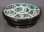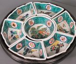 Black Wooden Vegetable Tray with Porcelain Sectional Inserts; painted black tray with hand painted oriental motif in each section (13 1/4" dia., 4 1/2" h.) bowl (5 1/2" dia.) six trays (6" l., 3 1/2" w.; two repaired) Black Wooden Vegetable Tray with Porcelain Sectional Inserts; painted black tray with hand painted oriental motif in each section (13 1/4" dia., 4 1/2" h.) bowl (5 1/2" dia.) six trays (6" l., 3 1/2" w.; two repaired)