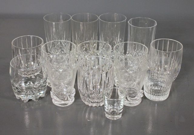 Group of Various Clear Tumblers and Glasses; three matching glasses (5 5/8" h.), three matching ( 3 3/4" h.) three matching (3 7/8" h.), one glass (5 1/4" h.) one glass (3 3/4" h.) one glass (3 1/2" h.) two matching (4 7/8" h.) one shot glass (2 1/2" h.) Group of Various Clear Tumblers and Glasses; three matching glasses (5 5/8" h.), three matching ( 3 3/4" h.) three matching (3 7/8" h.), one glass (5 1/4" h.) one glass (3 3/4" h.) one glass (3 1/2" h.) two matching (4 7/8" h.) one shot glass (2 1/2" h.)