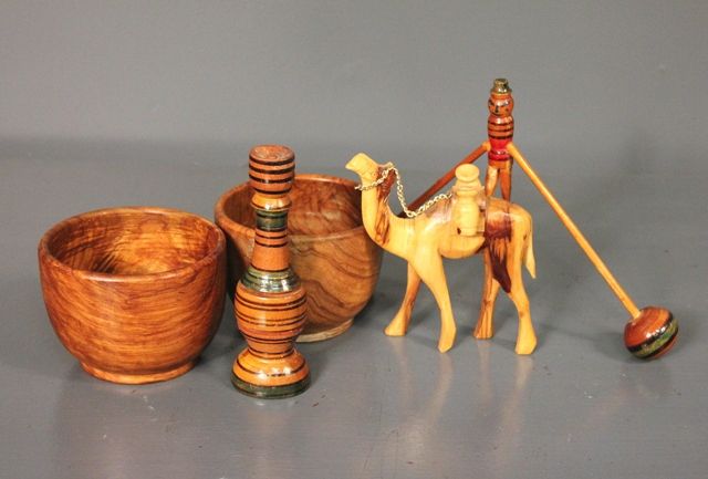 Group of Wooden Items; carved camel (5 3/4" h., 4 1/2" w.) carved stand ( 6 1/2" h.) two wooden bowls (3 1/2" h., 4 1/2" dia.) wood carving of man Group of Wooden Items; carved camel (5 3/4" h., 4 1/2" w.) carved stand ( 6 1/2" h.) two wooden bowls (3 1/2" h., 4 1/2" dia.) wood carving of man