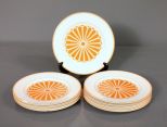 Set of Eight Fitz and Floyd Luncheon Plates; white and orange pattern, three with chips on rim; 7 1/2" dia. Set of Eight Fitz and Floyd Luncheon Plates; white and orange pattern, three with chips on rim; 7 1/2" dia.