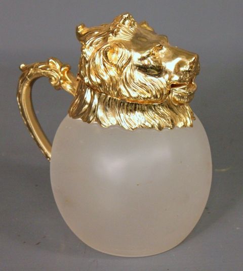 Translucent Pitcher with Gold Colored Lion's Head Lid and handle; 8 1/4" h., 5 1/2" across Translucent Pitcher with Gold Colored Lion's Head Lid and handle; 8 1/4" h., 5 1/2" across