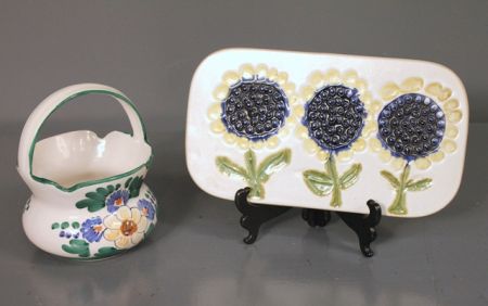 Two Pieces of Pottery; wall plaque with sunflowers (11" l., 6" w.), hand painted basket with flowers and green trim (7" h., 5 1/4" dia.) Two Pieces of Pottery; wall plaque with sunflowers (11" l., 6" w.), hand painted basket with flowers and green trim (7" h., 5 1/4" dia.)