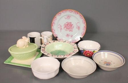 Group of Various Bowls, Plates, Cups and Decorative Rabbit Dish; two coffee mugs, plate (9" dia.), five bowls (8 3/4 to 5 1/2" dia.) Green oval shaped covered dish with rabbit on lid (6 1/2" l.,4 3/4" w., 5 1/2" h.) Group of Various Bowls, Plates, Cups and Decorative Rabbit Dish; two coffee mugs, plate (9" dia.), five bowls (8 3/4 to 5 1/2" dia.) Green oval shaped covered dish with rabbit on lid (6 1/2" l.,4 3/4" w., 5 1/2" h.)