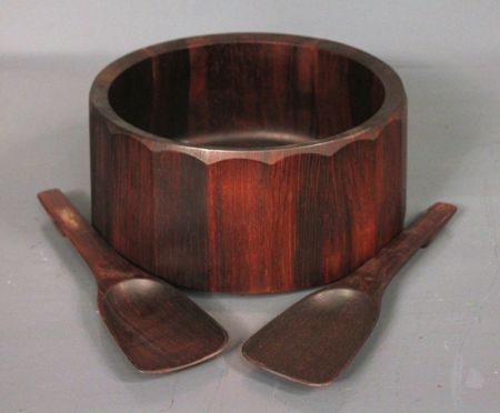 Large Wooden Dansk Design Salad Bowl and Servers; marked on bottom Dansk Design Denmark; 5" h., 10" dia., servers 11" l. Large Wooden Dansk Design Salad Bowl and Servers; marked on bottom Dansk Design Denmark; 5" h., 10" dia., servers 11" l.