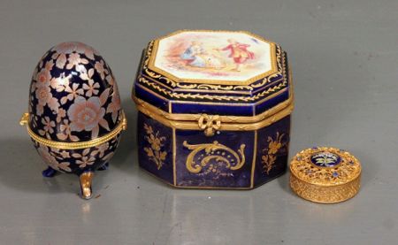 Three Jewelry or Trinket Boxes; large trinket box, cobalt with gold accent with lady and gent scene on lid (3" h, 4" w.), footed egg shaped trinket box, blue with gold accent and floral design (4" h., 2 1/2" w.), small trinket box with hand painted flowers on top with jeweled accents, mirror on interior lid (1 3/4" dia., 3/4" h.) Three Jewelry or Trinket Boxes; large trinket box, cobalt with gold accent with lady and gent scene on lid (3" h, 4" w.), footed egg shaped trinket box, blue with gold accent and floral design (4" h., 2 1/2" w.), small trinket box with hand painted flowers on top with jeweled accents, mirror on interior lid (1 3/4" dia., 3/4" h.)