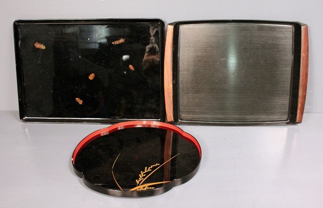 Three Black Serving Trays; black tray with wood design handles (17 1/2" l., 13 1/4" w.), Rectangle shape with painted feather design (19" l., 13 1/4" w.), round tray with painted gold wheat design (13 3/4" dia.) Three Black Serving Trays; black tray with wood design handles (17 1/2" l., 13 1/4" w.), Rectangle shape with painted feather design (19" l., 13 1/4" w.), round tray with painted gold wheat design (13 3/4" dia.)
