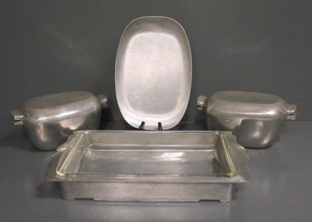 Group of Four Cookware Items; tray (12" x 8"), two covered casseroles (11" x 6 1/2"), server with glass Pyrex dish (17 1/4" x 10 1/4") Group of Four Cookware Items; tray (12" x 8"), two covered casseroles (11" x 6 1/2"), server with glass Pyrex dish (17 1/4" x 10 1/4")