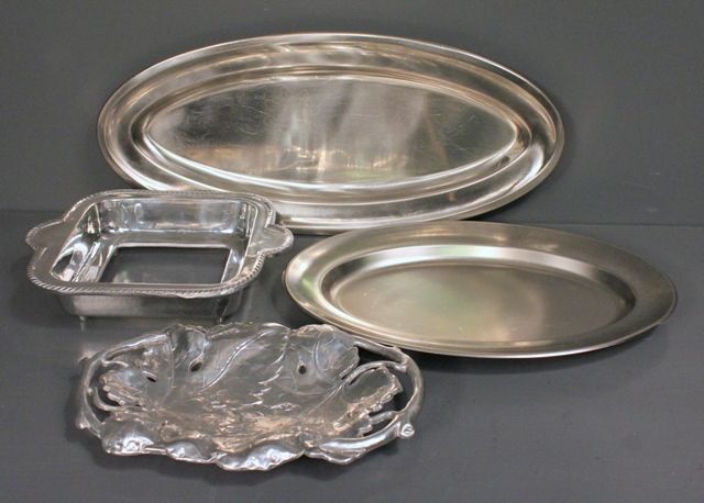 Group of Four Serving Trays; footed grape leaf design tray (14" x 9"), footed casserole server (13" x 10 1/4"), oval stainless steel platter (25" x 11") oval stainless platter (18 1/2" x 12 1/4") Group of Four Serving Trays; footed grape leaf design tray (14" x 9"), footed casserole server (13" x 10 1/4"), oval stainless steel platter (25" x 11") oval stainless platter (18 1/2" x 12 1/4")