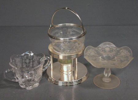 Etched glass compote (3 1/2" h.), etched glass creamer (3" h.), Silverplate burner with candle (4" h.) pressed glass bowl with sterling rim and handle (2 1/2" h.) Etched glass compote (3 1/2" h.), etched glass creamer (3" h.), Silverplate burner with candle (4" h.) pressed glass bowl with sterling rim and handle (2 1/2" h.)