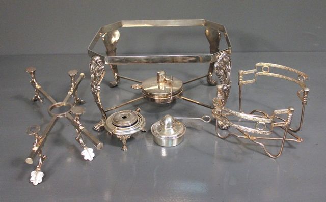 Group of Casserole Stands and Burners, casserole stand with burner (Silverplate 7" h., 11" w.), plate stand (WA) Silverplate, English bowl carrier (ornate, Silverplate), two Silverplate burners Group of Casserole Stands and Burners, casserole stand with burner (Silverplate 7" h., 11" w.), plate stand (WA) Silverplate, English bowl carrier (ornate, Silverplate), two Silverplate burners