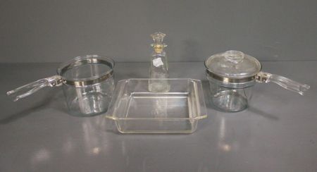 Group of Four Glassware Cooking Items; two Pyrex pots (5" h.), decanter with stopper (7 1/2" h.), Pyrex casserole ovenware (2 1/2" h., 8 1/2" w.) Group of Four Glassware Cooking Items; two Pyrex pots (5" h.), decanter with stopper (7 1/2" h.), Pyrex casserole ovenware (2 1/2" h., 8 1/2" w.)