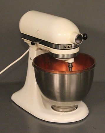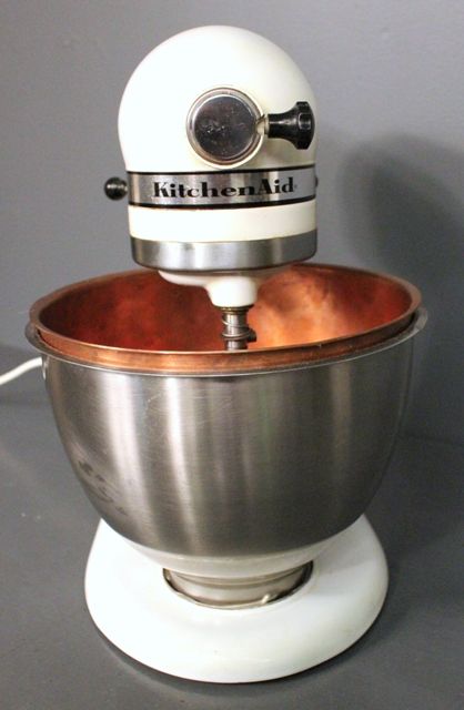 White Kitchen Aid Stand Mixer, 10 speed control, 2 bowls; one copper bowl and one stainless, mixer attachment White Kitchen Aid Stand Mixer, 10 speed control, 2 bowls; one copper bowl and one stainless, mixer attachment
