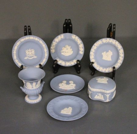 Seven Pieces of Wedgwood China; five plates (4" dia.), jar (2" h.), vase ( 3 1/2" h.) Seven Pieces of Wedgwood China; five plates (4" dia.), jar (2" h.), vase ( 3 1/2" h.)