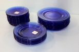 Set of nine 8" blue depression glass plates, set of five 7" blue depression glass plates, set of eighteen 6" blue depression glass plates & set of thirteen blue depression glass saucers. Set of nine 8" blue depression glass plates, set of five 7" blue depression glass plates, set of eighteen 6" blue depression glass plates & set of thirteen blue depression glass saucers.