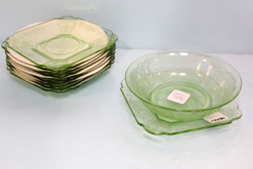 349 Ten Square Green Depression Glass Plates & One Bowl