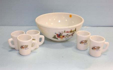 393 McKee White Christmas Tom and Jerry Punch Bowl & Five Cups