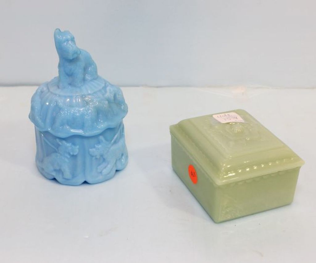 411 Blue Glass Covered Dog Dish & Jadite Covered Jar