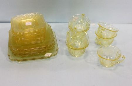 Seven yellow depression glass cups, fourteen 5 1/2" plates, eight 7 7/8" plates, two 9" plates; 31 total pieces Seven yellow depression glass cups, fourteen 5 1/2" plates, eight 7 7/8" plates, two 9" plates; 31 total pieces