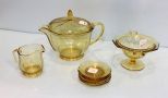Yellow glass pitcher with lid, candy dish, mug & five 3 1/2" dia. plates Yellow glass pitcher with lid, candy dish, mug & five 3 1/2" dia. plates