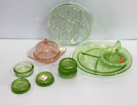Five green glass coasters, trivet, butter dish, 5" basket & divided dishes Five green glass coasters, trivet, butter dish, 5" basket & divided dishes
